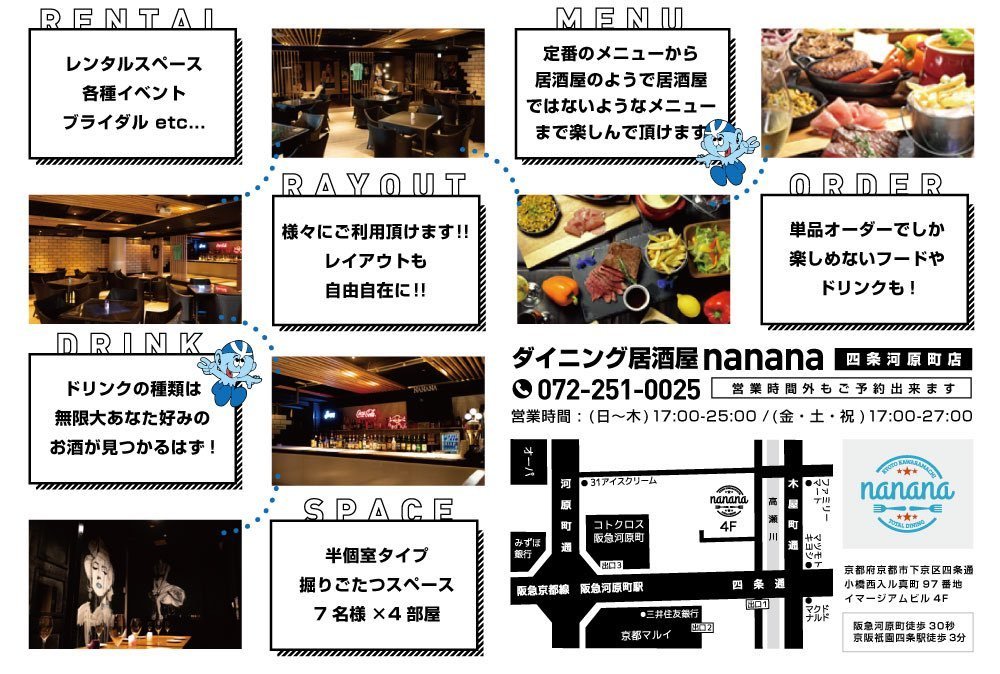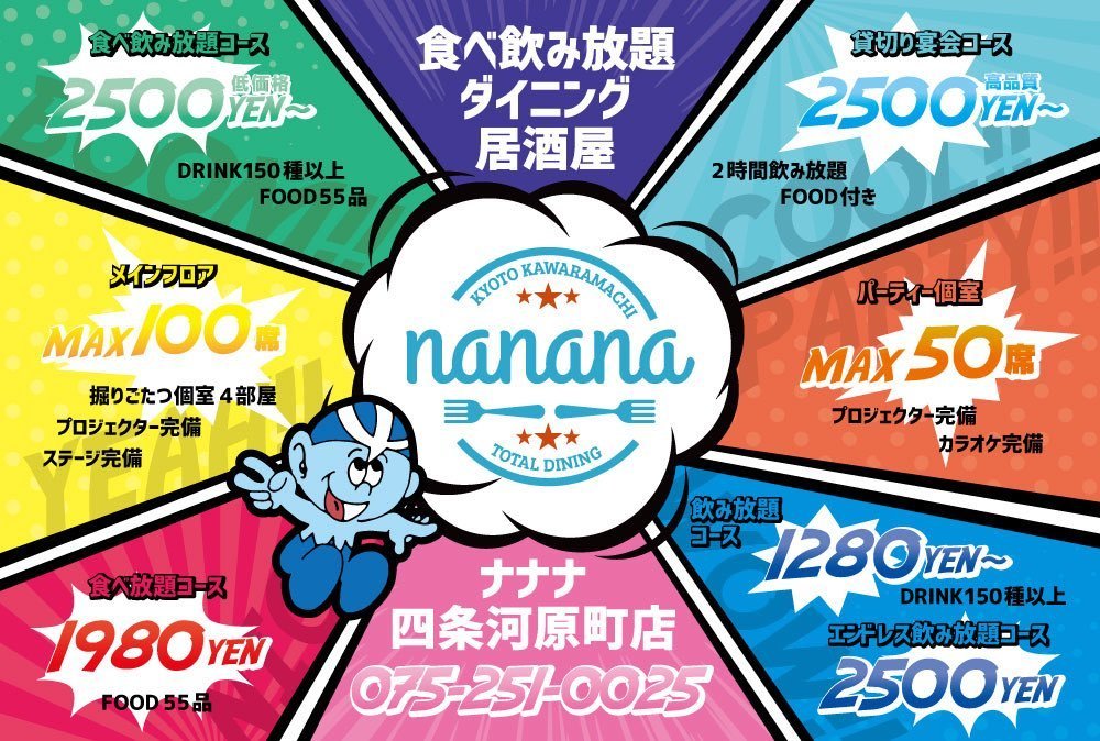 本日‼️まだ×❷空席アリます‼️団体様も大歓迎★★✨激アツクーポン配信中!!!四条木屋町☆河原町へお越しの際はダイニング居酒屋「nanana」へ是非!当日予約はこちら→→→☎️075-251-0025